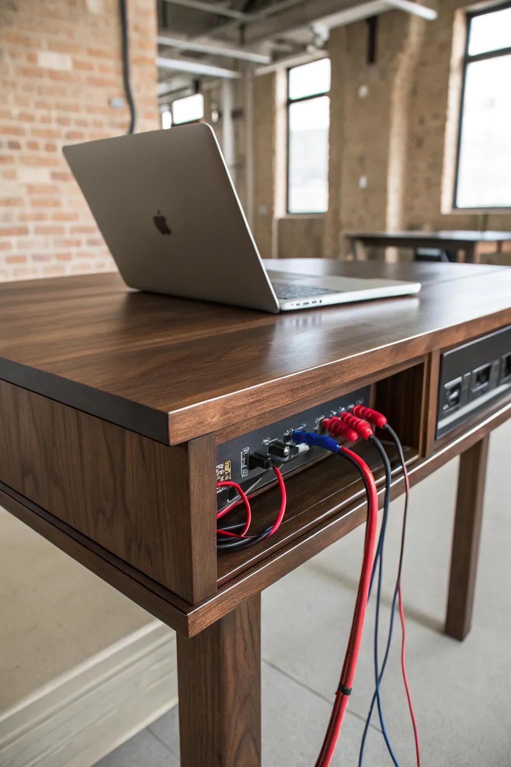 Consider a standing desk with built-in cable management features. It’s an all-in-one solution that simplifies organizing and enhances the overall aesthetic.