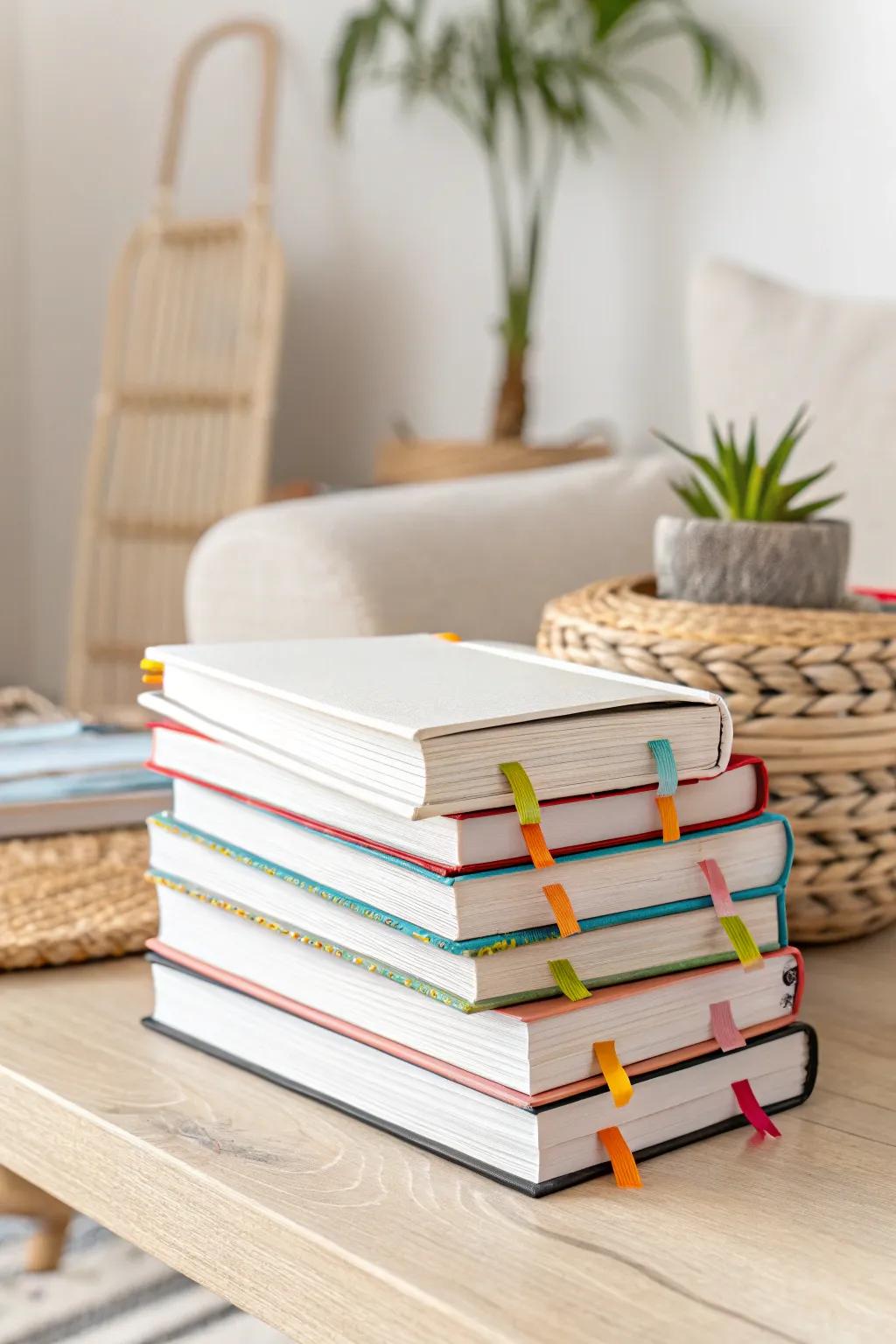 Embrace the charm of a book stack with colorful tabs, where simplicity meets artistic flair.