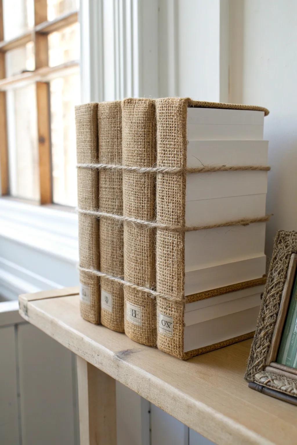 Give your bookshelf a cohesive look by wrapping books with burlap. It’s a clever way to hide mismatched covers.