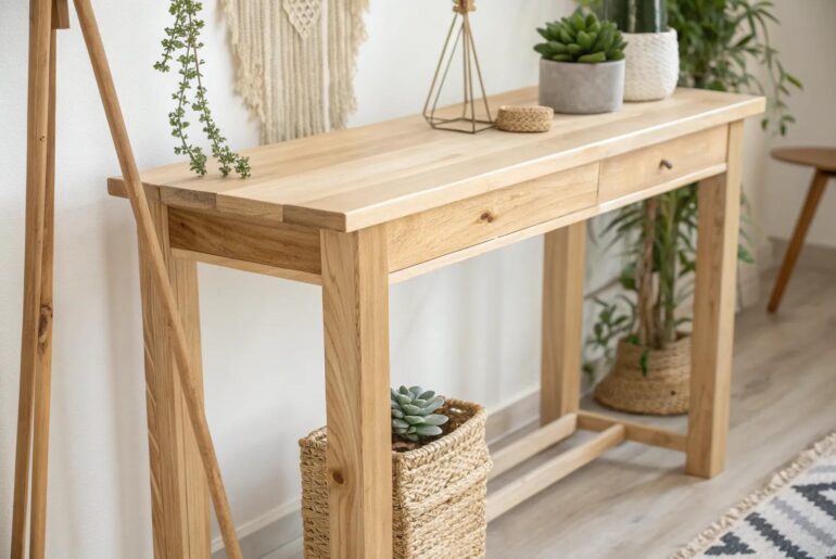 Looking to add a personal touch to your home with a stylish and functional piece? A DIY console table might be just the project for you! 1. Repurposed Bookshelf Console Minimalist charm meets functional elegance: repurpose your bookshelf into a chic console table. Transform a small bookshelf into a console table. I simply added a wooden top, and now it’s a stylish spot for my favorite decor pieces. May just do the trick: Wood Stain…