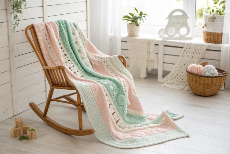 There’s something truly special about wrapping a little one in a handmade knitted blanket. It’s not just a cozy cover; it’s a hug, a keepsake, and a piece of your heart. 1. Seaside Serenity Wrap your little one in seaside serenity with this beautifully crafted baby blanket, inspired by the calming ocean waves. Bring the calming vibes of the ocean into your nursery with a seaside-themed blanket featuring waves or seashells. Try these: Ocean-Themed Yarn…