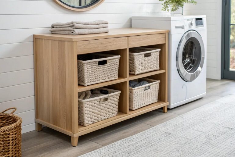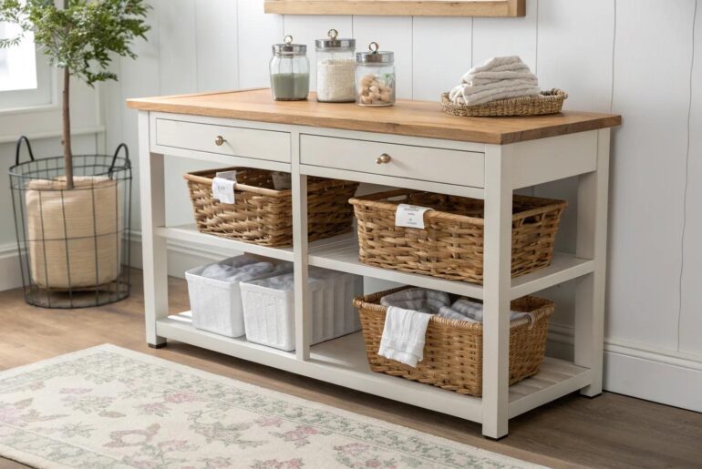 A well-organized laundry room can make the chore of laundry a little less daunting and a lot more efficient. Let’s dive into some creative folding station ideas that could transform your laundry space into a functional and stylish sanctuary. 1. Countertop Wonder Elevate your laundry routine with a stunning beechwood countertop that blends Scandinavian minimalism with Boho charm. #LaundryRoomGoals Transform your laundry room with a spacious countertop that provides ample space for folding clothes. I…