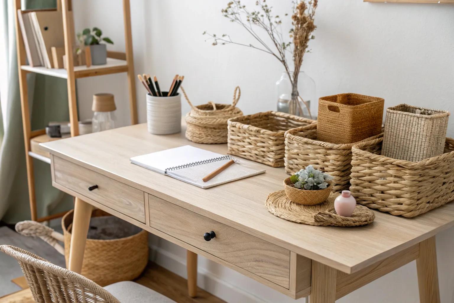 Elevate your workspace with chic under-desk storage bins that blend minimalism with natural beauty.