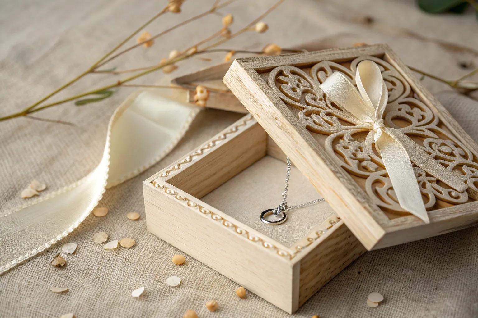 Add a layer of mystery by using a box with a hidden compartment. The surprise of discovering the jewelry is half the fun.
