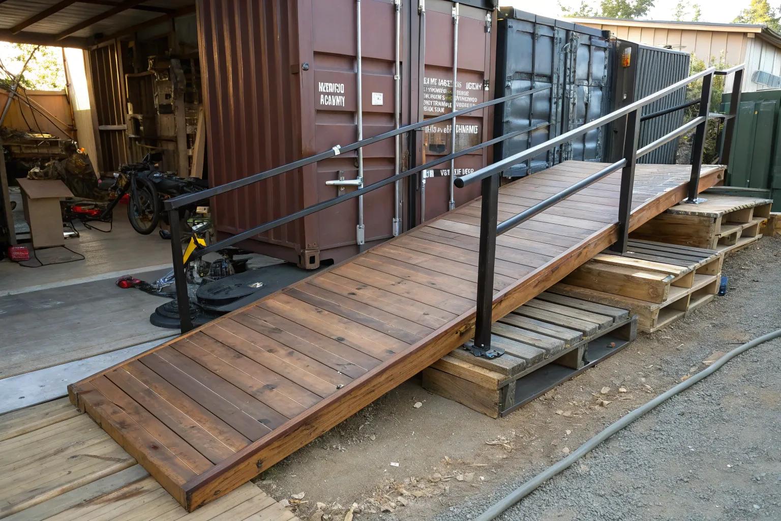 Create a modular ramp with interconnected panels that you can easily assemble and disassemble. I love this design for its flexibility, especially when we need to relocate containers.
