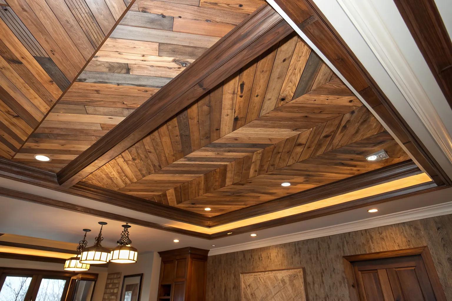 A herringbone pattern can turn a simple wood ceiling into a work of art. I tried this with leftover wood pieces, and it’s now the highlight of my dining area.