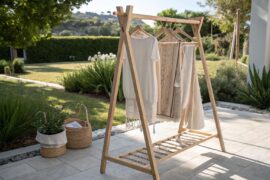 - Compact Wooden Clothes Rack: Utilize your corner space with this stylish wooden rack for efficient laundry organization.