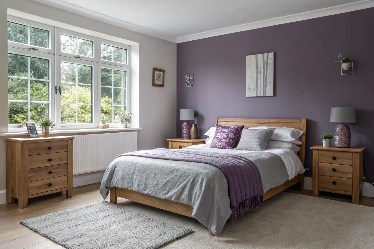 Layer your bed with different shades of purple and grey to add depth and comfort. This tactic makes the bed the centerpiece, inviting relaxation and repose.