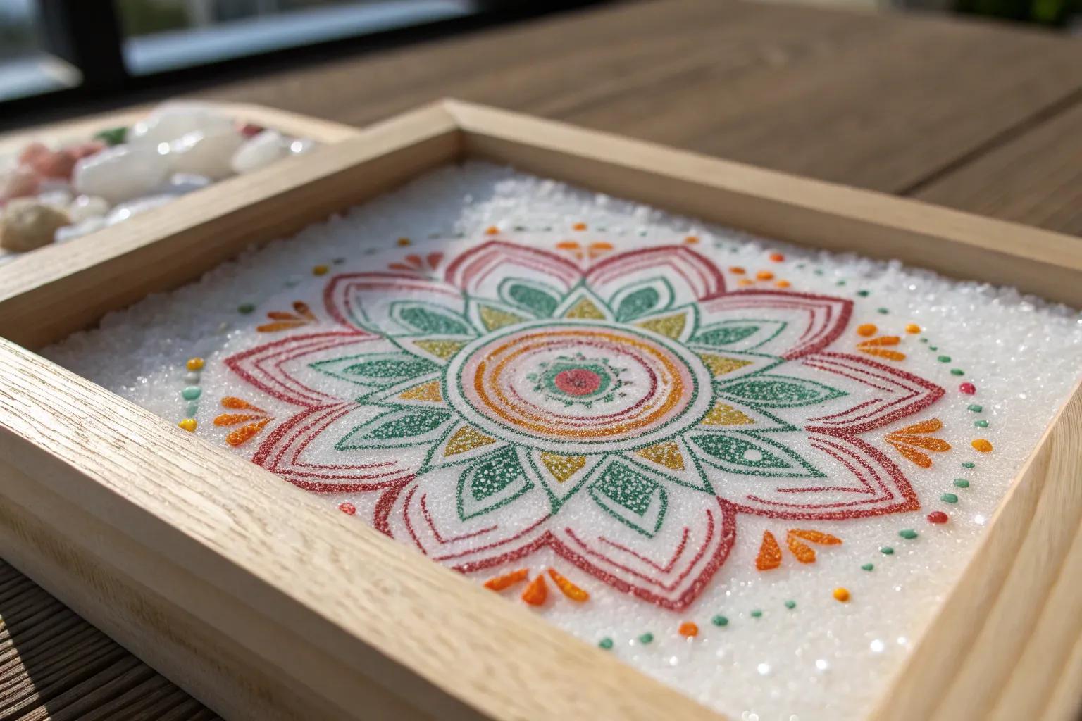Find your Zen with salt-painted mandalas. The intricate patterns combined with the flowing colors create a calming, meditative art piece.
