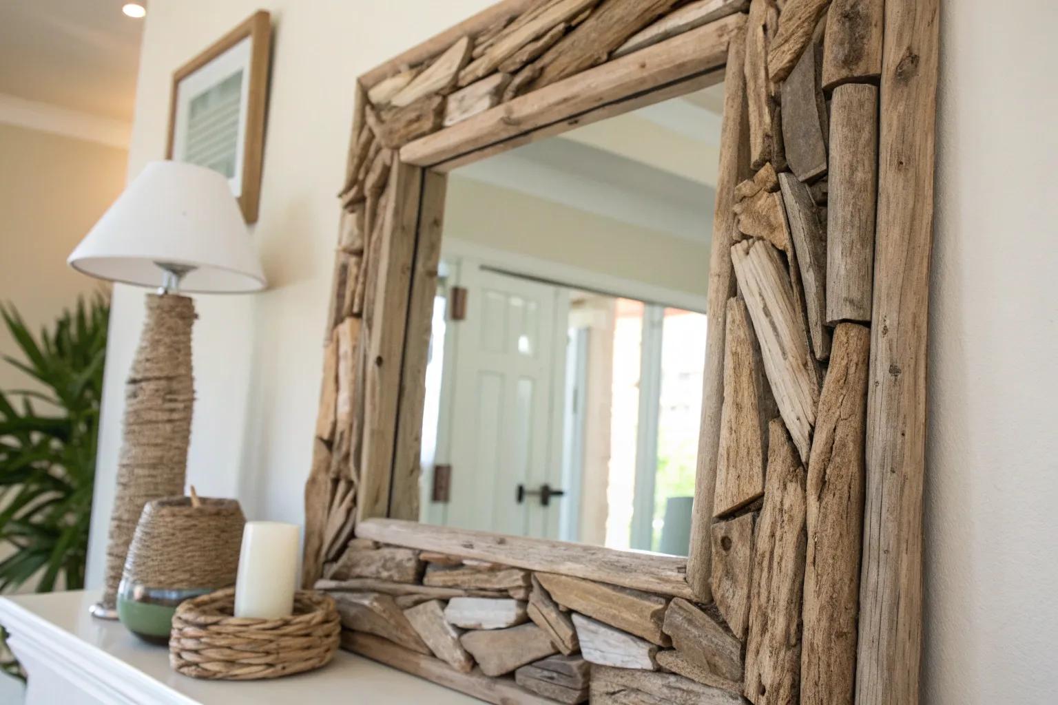 Create a coastal vibe with driftwood pieces. I enjoyed gathering driftwood from the beach and arranging them around my mirror for a serene, natural look.